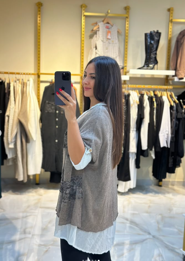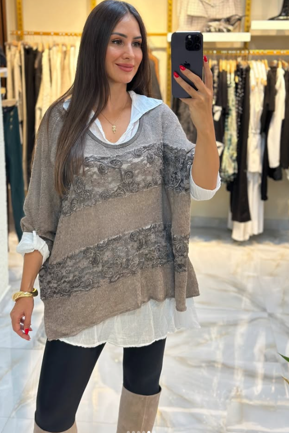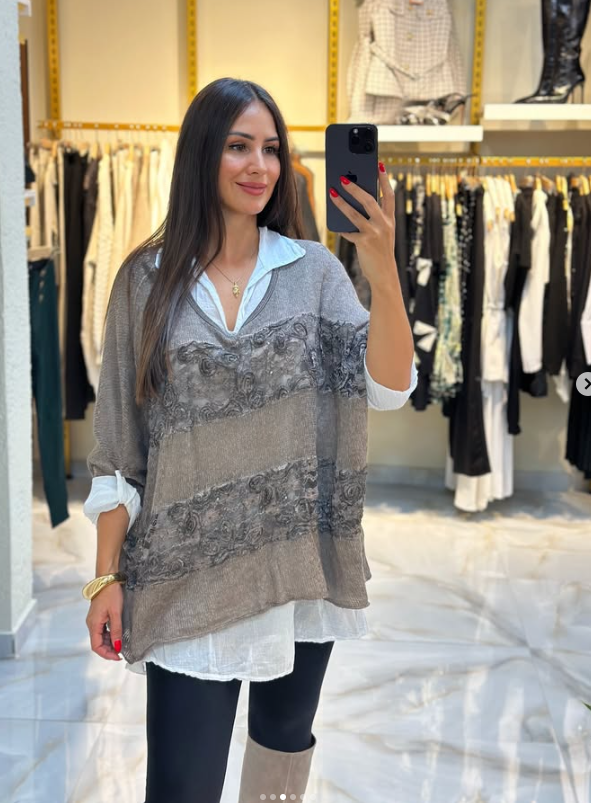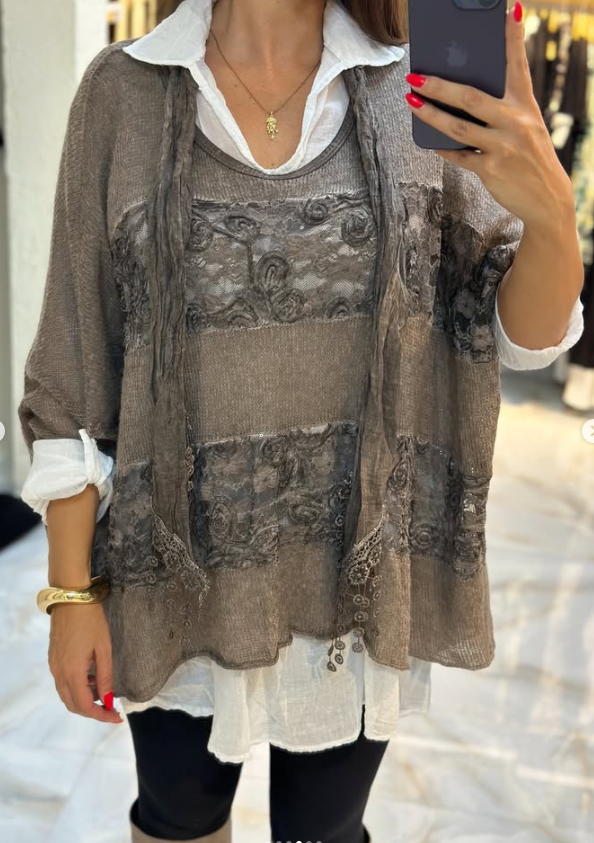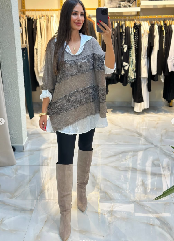 İthal gömlekli vizon triko tunik; dantel detayları ve dökümlü formuyla şıklığı konfora dönüştürüyor.