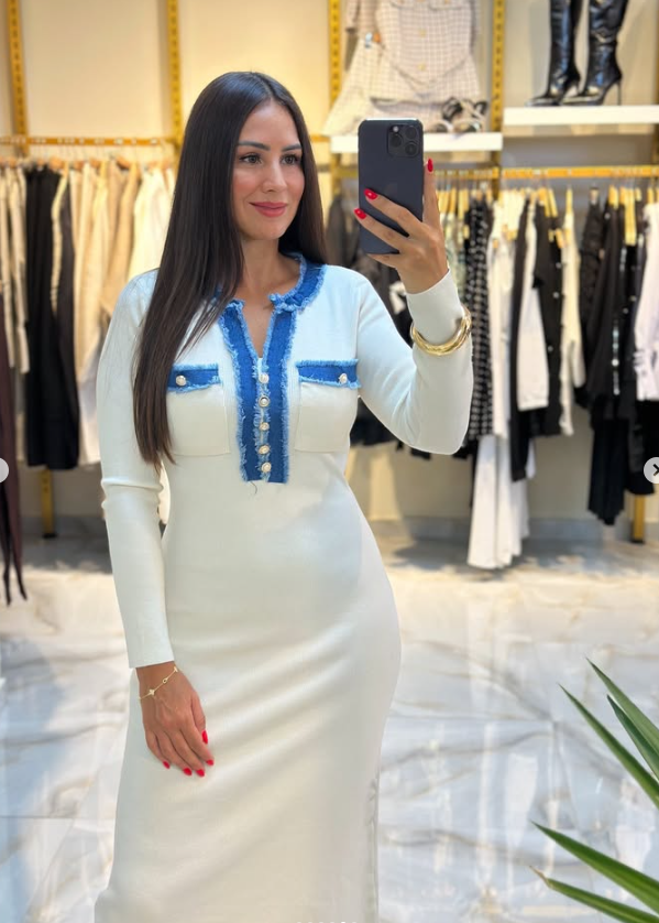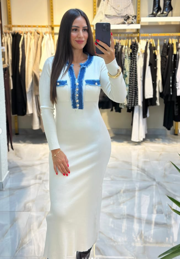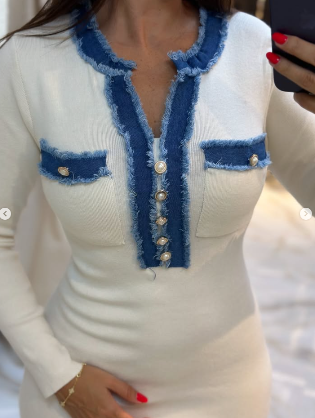 Mavi denim detaylarla modernize edilen bu triko elbise, sade ama bir o kadar da çarpıcı.