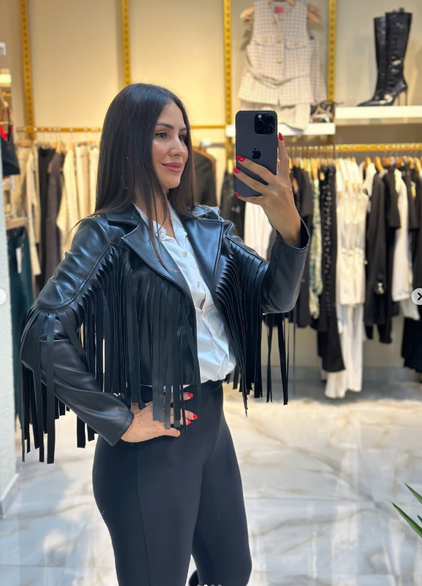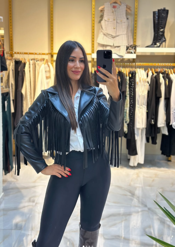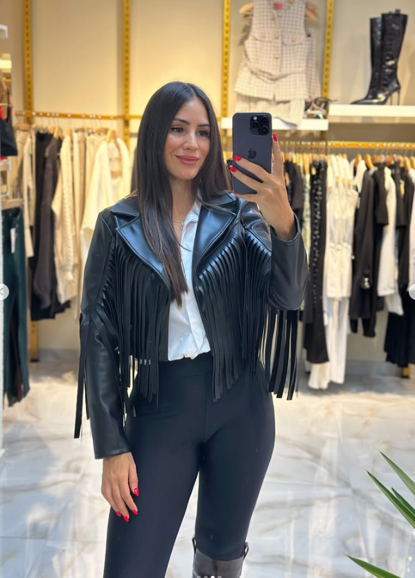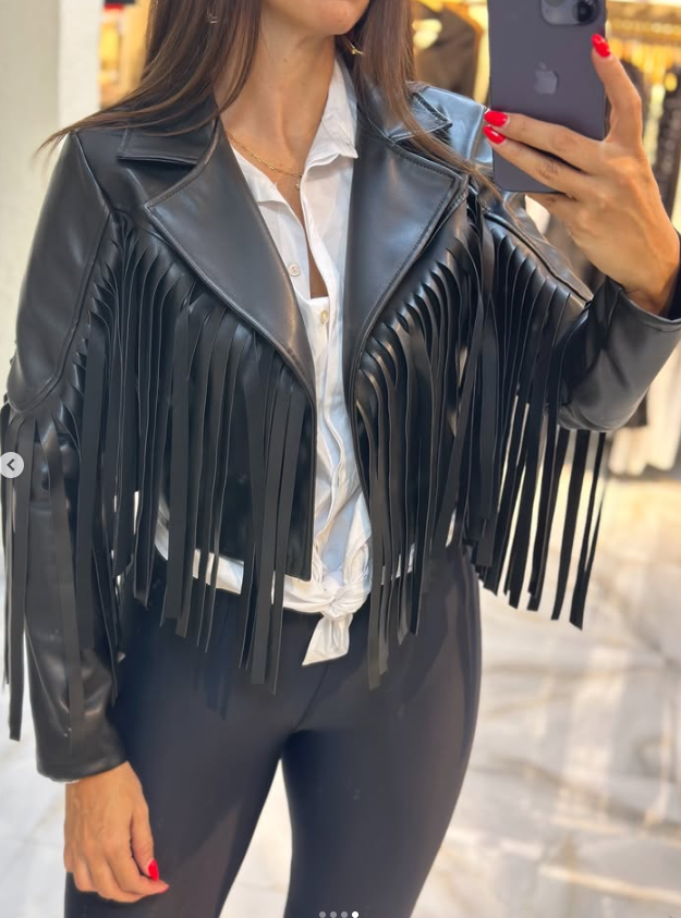 Gerçekçi dokulu ithal deri kumaşı, hareketli püskülleri ve modern kısa kesimiyle kombininize anında güçlü bir duruş katıyor.