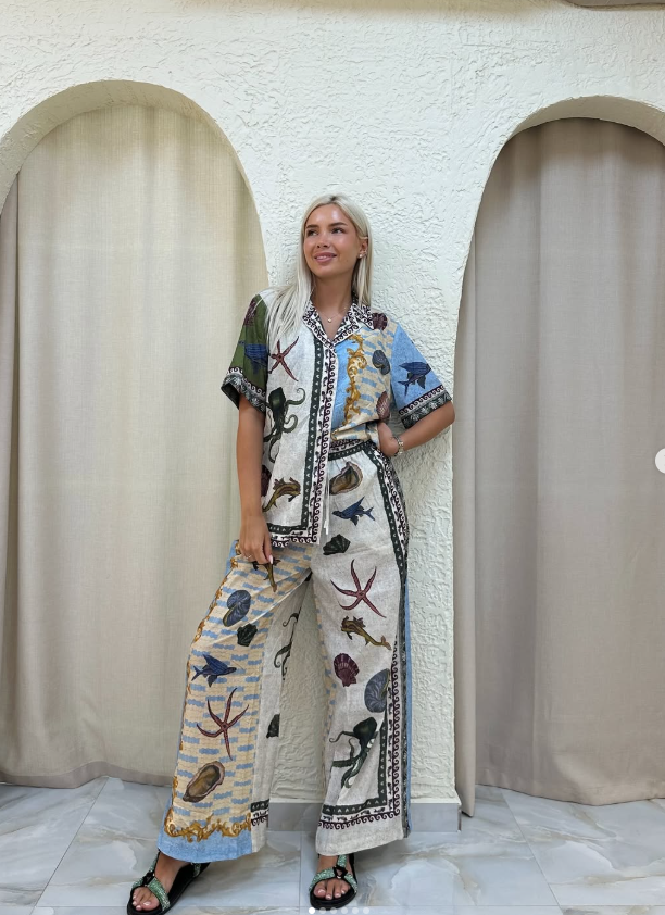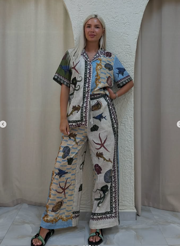 Deniz kabukları, mercanlar ve deniz canlılarıyla süslenmiş bu ithal tasarım keten ikili takım, özgün desenleri ve rahat kalıbıyla fark yaratıyor. Hafif yapısıyla sıcak havalarda maksimum konfor sağlarken, sanatsal dokusuyla tarzınızı bambaşka bir seviyeye taşıyor.