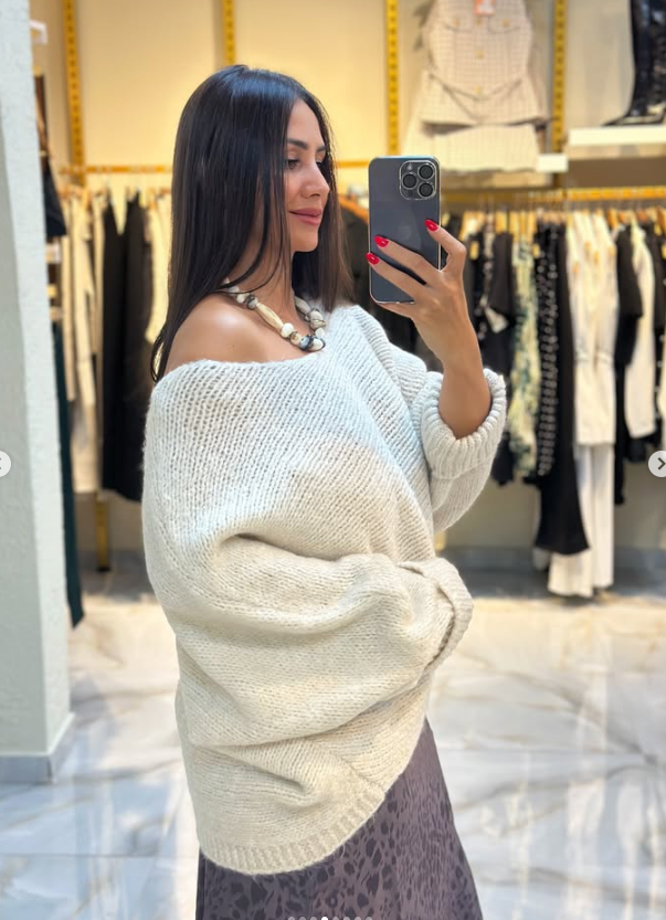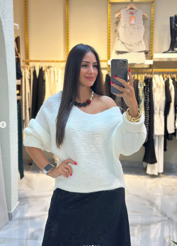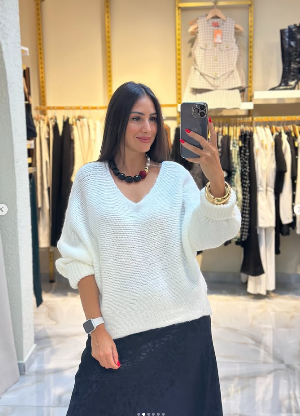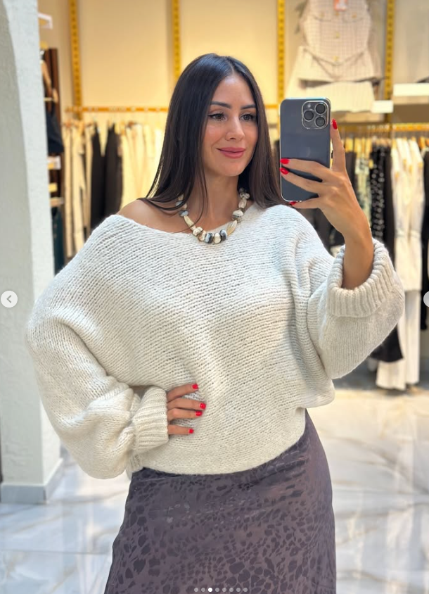 Saten siyah etek ve yumuşacık ekru triko kazak, birlikte zarif ama bir o kadar da iddialı bir duruş sergiliyor.