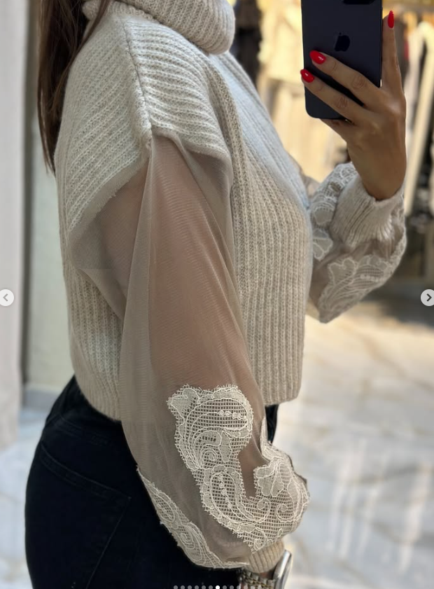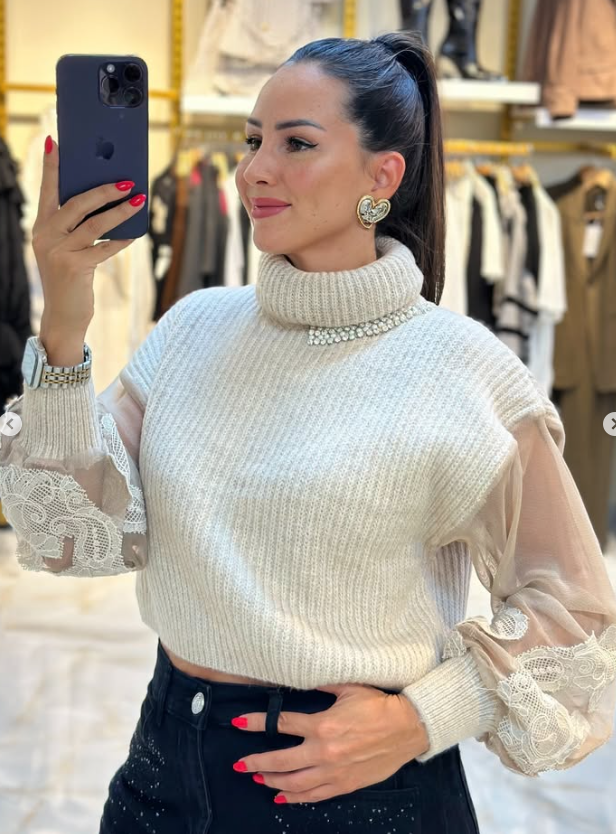 Tasarım kolları tüllü, işlemeli kazak ve taşlı balon model jean mükemmel bir uyum içinde.