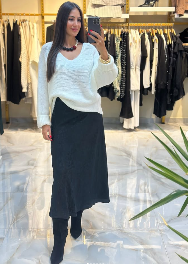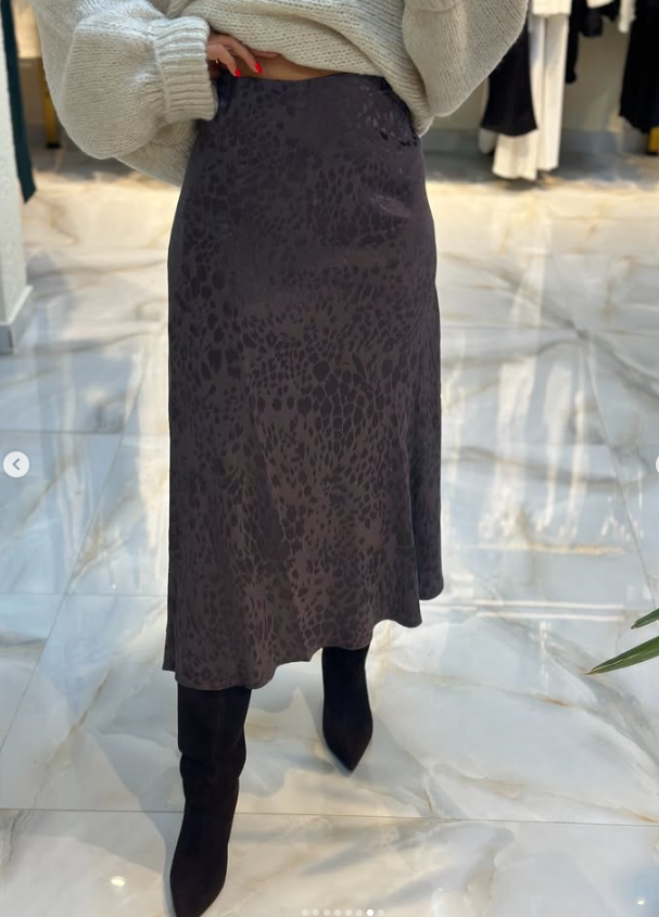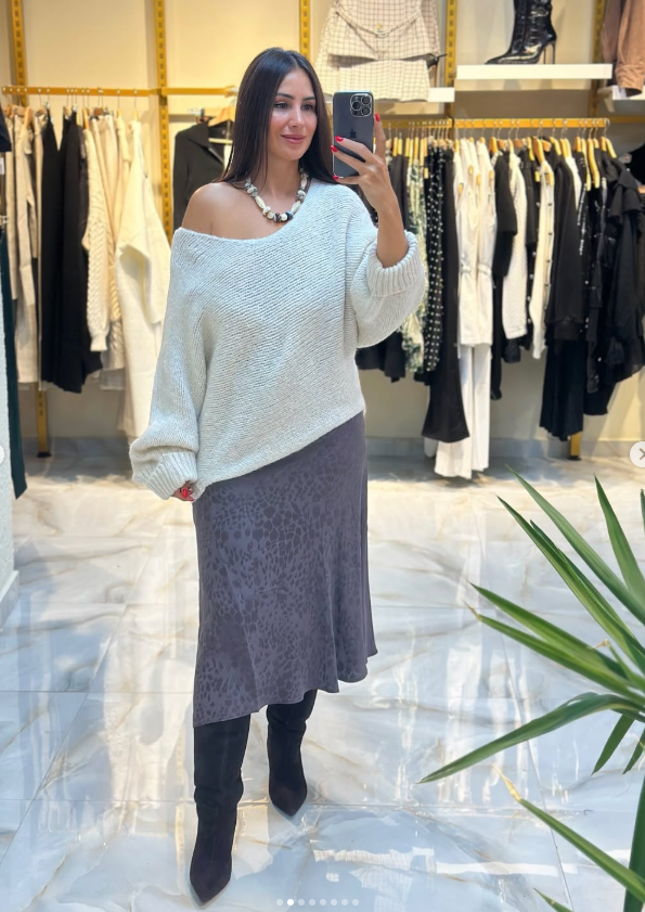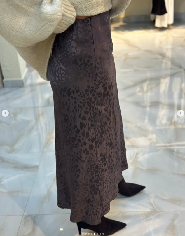 Bej tonlardaki triko kazak, saten dokulu leopar etekle birleşerek bohem ve zarif bir görünüm sunuyor.