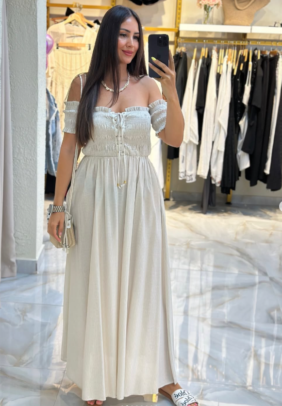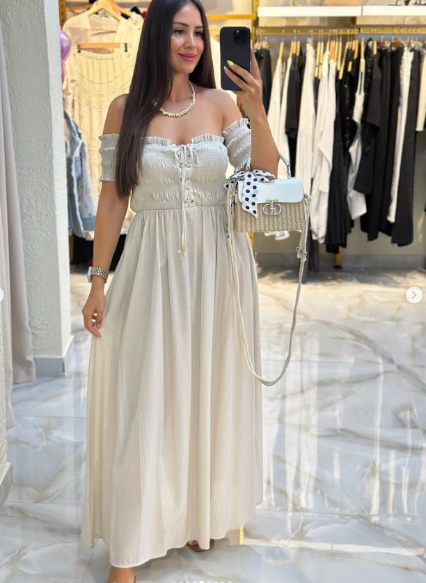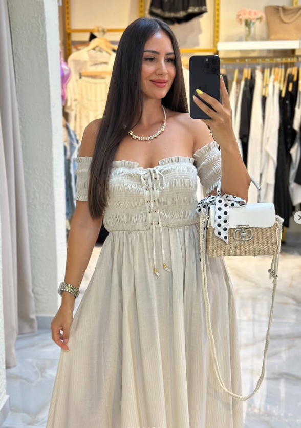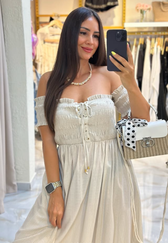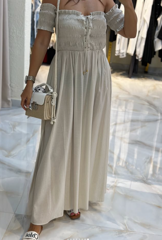 Doğal tonları ve hafif dokusuyla, sıcak havalarda hem şıklık hem de konfor sunan bu elbise tam bir kurtarıcı parça.